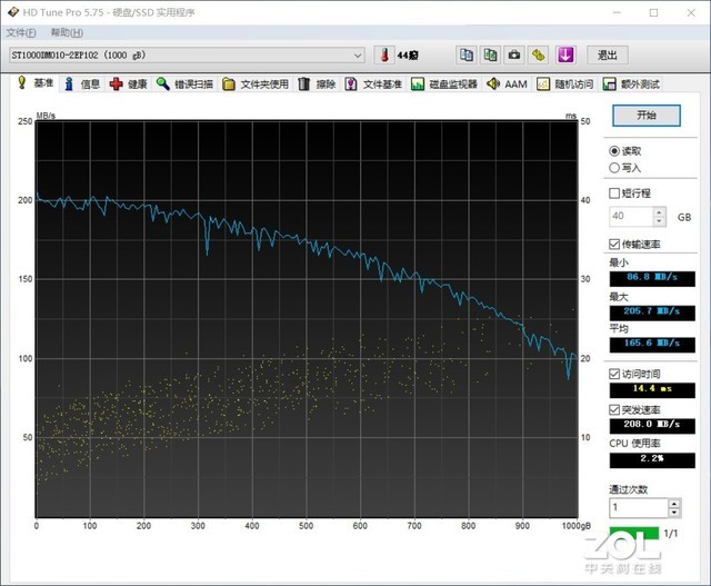 然后黄瓜网站视频再使用 HD Tune Pro 硬盘检测工具进行 1TB 读取速度测试,较低 86.8MB/S,较高 205.7MB/S,平均速度 165.6MB/S。