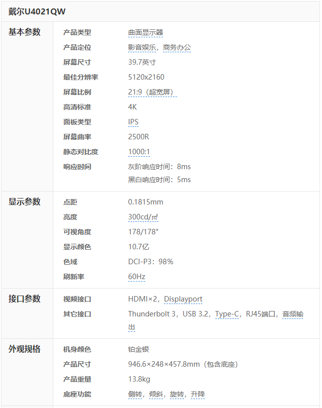 戴尔U4021QW在接口、支架功能、面板调节按钮方面,都有十分丰富的功能。尤其是雷电3接口的加入,优化了职场人士使用显示器时的连接流程,让工作变得更为连贯、高效。所以这款显示器的使用体验,评定为良好。