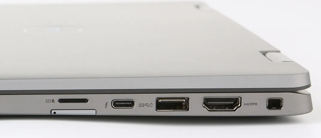 作为一台商用本,Latitude 7320二合一笔记本没有因为轻薄而对接口妥协。这台机器配备两个Thunderbolt 4接口、一个USB 3.2 Gen1 Type-A接口、一个HDMI 2.0接口、一个SD读卡器插槽、一个3.5mm音频接口以及一个Micro-SIM卡插槽(选配,并非Nano SIM插槽)。这样的接口配置可以满足大多数商务人士对笔记本扩展接口的使用需求。