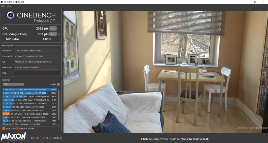 CINEBENCH R20处理器单/多线程渲染性能 551pts/2092pts