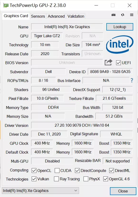 此外,酷睿i7-1185G7处理器内置锐炬Xe显卡,锐炬Xe显卡的Boost频率可达1350MHz,拥有完整的96个EU执行单元。在3DMark Fire Strike中,这台机器得到4474的总分和5402的显卡分数,从显卡分数来看,该显卡的理论性能在MX350独显(图形分数大约4350左右)之上,不过和其他同配置的笔记本电脑相比有大概7%的差距。考虑到Latitude 7320二合一笔记本是一台小巧轻薄的商用本,这样的表现也可以理解。