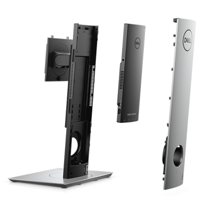 这款兼容 VESA 的支架可以一次性调节显示器高度,支持的显示器尺寸较大为 60.96 厘米/24"。支架随附在超小型机固定支架配置之内,也支持销售后购买。