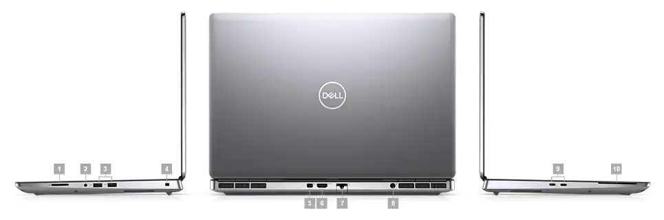 1. SD 卡读卡器 | 2.耳机插孔 | 3.2 个 USB 3.2 第 1 代 Type-A 端口,支持 PowerShare | 4.线缆锁槽 | 5.迷你 DP 1.4 端口 | 6.HDMI 2.1 端口 | 7.RJ-45 端口 | 8.电源端口 | 9.2 个 USB 3.2 第 2 代 Type-C® Thunderbolt 4.0 端口 | 10.智能卡读卡器(可选)