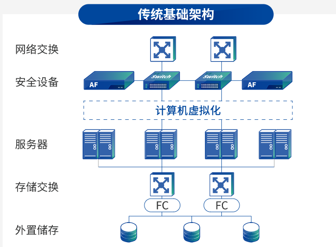超融合基础架构(Sangfor HCI)仅需通用的服务器和交换机硬件,利用软件定义技术构建计算、存储、网络和安全的统一资源池,替代复杂的传统烟囱式架构,实现基础架构的极简化。